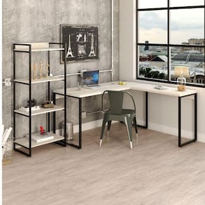 O conjunto Home Office é composto por 2 peças, sendo uma escrivaninha em L e uma estante com 4 prateleiras.