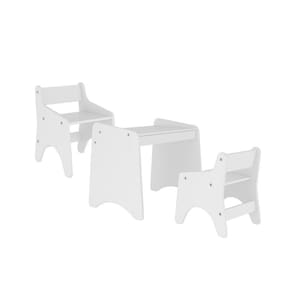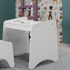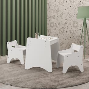 Conjunto Infantil 3 Peças 1 Mesa 2 Cadeiras com Regulagem Movelbras Branco. O conjunto de mesa com duas cadeirinhas, além de ser um charme, pode ser utilizado em vários lugares da casa. A cadeirinha possui encosto, seu formato arredondado proporciona conforto e segurança. Suporta até 50 kg. Seu assento possui 2 regulagens de altura. Resistente e funcional, a mesa foi desenvolvida para ser um local de atividades, onde a criança pode fazer o lanche, desenhar, pintar e brincar. Possui uma gaveta com divisões que auxilia na organização dos materiais. O tampo da mesa possui 3 regulagens de altura. Ean: 7909903148501