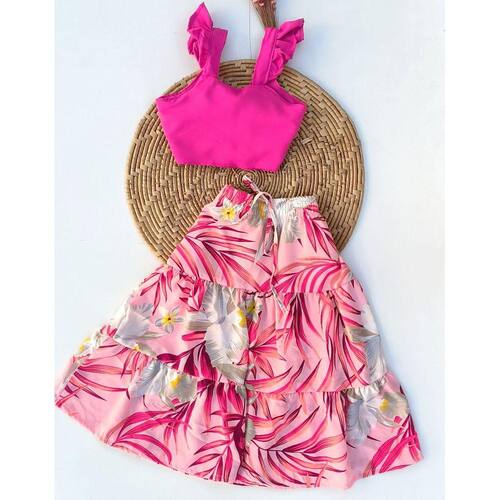 Conjunto feminino infantil, saia longa e cropped com amarras atrás para melhor ajustar ao corpo. Para as meninas que gostam de se vestir com estilo.