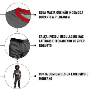 Enquanto outras roupas infantis limitam os movimentos, este conjunto abraça o corpo com flexibilidade graças à malha elástica nos joelhos e na calça e à camisa com gola macia que não incomoda durante a pilotagem.
