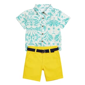 Conjunto Infantil Camisa Floral e Bermuda Azul  Amarelo Social é ideal para ocasiões especiais e dias quentes. A camisa de manga curta tem estampa floral tropical em azul e branco, com botões frontais, perfeita para eventos formais com toque leve. A bermuda  Amarelo e azul social acompanha cinto embutido, oferecendo um visual elegante e confortável.