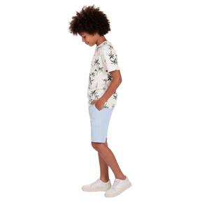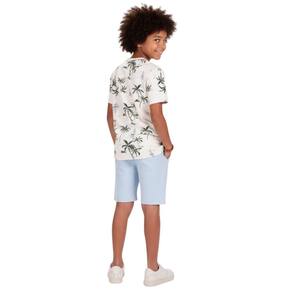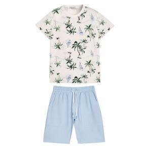 Conjunto Infantil Trick Nick composto por camiseta em cotton leve com estampa rotativa de coqueiros e barcos, e bermuda azul em moletinho denim. A camiseta tem decote com reforço nas costas, oferecendo durabilidade. Já a bermuda conta com elástico na cintura, cordão decorativo e bolsos laterais, garantindo conforto e praticidade para o dia a dia.