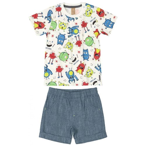 Conjunto Infantil Camiseta em Malha e Bermuda em Tecido Monstros Bege Up Baby Ref. 42774
