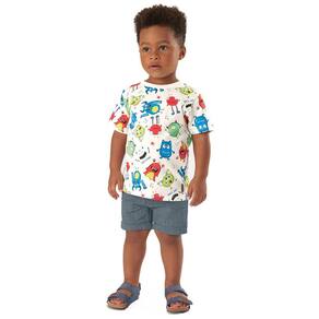 Camiseta com estampa de monstrinhos e bermuda com efeito de lavanderia.