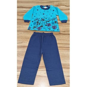 Composto por duas peças, o conjunto traz um casaco azul com estampa delicada de flores e calça combinando, perfeito para manter o aquecimento com muito estilo.