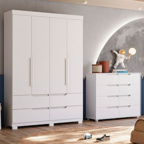 Quarto Infantil Completo Circus: composto por guarda-roupa com 04 portas, 04 gavetas com corrediças telescópicas, cabideiro em alumínio e puxadores em MDF revestidos. Acompanha cômoda com 08 gavetas, também com corrediças telescópicas e puxadores cava, que dispensam o uso de puxadores externos. Funcionalidade, charme e praticidade para o quartinho dos sonhos! Altura do Conjunto: 230 cm Ambiente Principal: Quarto Infantil codigo_ean: 7900288199263 Complexidade da Montagem: Alta: deve ser montado por um montador especializado Cor: Branco Cor do Produto: Branco Escala de Brilho: Fosco Informações Complementares: Cômoda Suporta 40 Kg - Vistas da Cômoda Flex Largura do Conjunto: 296 cm Linha ou Coleção: Circus Manual de Especificação Técnica: https://cdn2.madeiramadeira.com.br/atributo/albatroz-moveis/3088525-675-17532017264039.pdf Manual de Montagem e Instalação: https://cdn2.madeiramadeira.com.br/atributo/albatroz-moveis/3088696-675-17532052139062.pdf Marca: Albatroz Móveis Material Principal: MDP Medida de Cada Item: 2,30 A X 1,60 L X 0,47 P M (GUARDA ROUPA) 1,16 A X 1,36 L X 0,45 P M (CÔMODA) modular: Não Necessita Montagem: Sim O Conjunto Contém: Cômoda/Guarda-Roupa Origem do Produto: Nacional Peso: 163.35 Porta Janelada: Não Possui Portas: Sim Quantidade de Portas: 04 Recomendações de Uso, Manutenção e Limpeza: Limpar com flanela ou pano macio seco, não utilizar produtos abrasivos, desengordurantes, álcool ou solvente. Não expor o produto diretamente á luz solar e á umidade. Sistema de Montagem: Parafusos, cavilhas e minifix Suporta Até (kg): 67