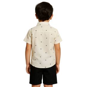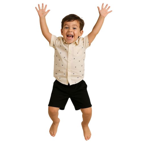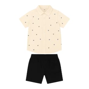 Garanta estilo e conforto para o seu pequeno com este conjunto infantil masculino composto por camisa bege clara com estampa minimalista e shorts preto. A camisa de manga curta é confeccionada em tecido leve e macio, com fechamento por botões frontais e caimento confortável, ideal para dias quentes. O shorts preto em tecido resistente possui cós com elástico para melhor ajuste e liberdade de movimento, perfeito para passeios, eventos ou uso diário. Um look versátil e moderno para qualquer ocasião.