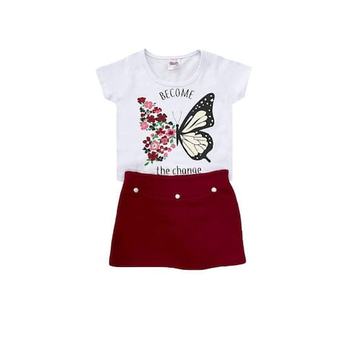 O Conjunto Infantil Menina Borboleta Blusa Cropped Vermelha com Short Saia - Cacaio é a coisa mais linda desse mundo! A blusa cropped foi fabricada em meia malha off white, possui linda estampa e strass que formam o desenho de uma borboleta com qualidade inigualável e sofisticação para qualquer momento. Já o short saia, foi feito em moletinho vermelho, possui aplicação de pompons e elástico na cintura.