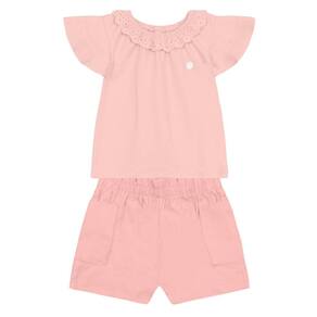 Encante-se com o conjunto infantil da Mundi, perfeito para as pequenas fashionistas! Composto por uma blusa de cotton com delicada gola em guipir e shorts em sarja linho, este conjunto oferece conforto e estilo. Os bolsos práticos e o cós elástico com babados adicionam um toque especial ao visual. Ideal para passeios e momentos de diversão, combine com sapatilhas e um laço no cabelo para um look adorável. Aposte na qualidade e charme que sua bebê merece!