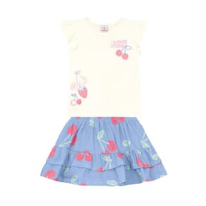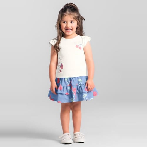 Encante sua pequena com o conjunto infantil menina confeccionado em malha, a blusa possui mangas curtas com babados, gola redonda e uma estampa localizada de frutinhas em puff com glitter. Já o shorts saia, conta com cós elástico e detalhes de babados. Ideal para os primeiros passos, este conjunto é perfeito para passeios e brincadeiras.