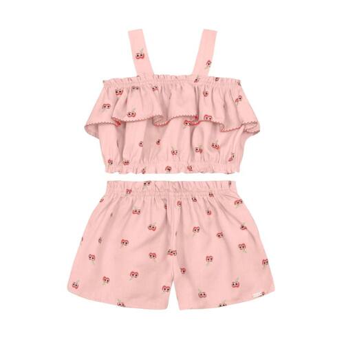 Deixe sua pequena ainda mais estilosa com o conjunto infantil da Mundi. A blusa cropped em liocel possui barra ajustada, babado e estampa de cerejas, além de alças regata que garantem frescor. O shorts com cós elástico complementa o look com a mesma estampa divertida. Ideal para dias quentes, esse conjunto une conforto e charme, permitindo que as meninas brinquem à vontade. Combine com sandálias e um chapéu para um visual perfeito de verão.