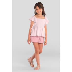 Deixe sua pequena deslumbrante com o conjunto infantil da Mundi! Composto por uma blusa em meia malha, apresenta delicados babados nas mangas e na barra, além de um elegante decote quadrado. O shorts, confeccionado em moletinho quadrile com cós elástico, garante conforto e liberdade de movimento. Ideal para dias de diversão e brincadeiras, esse look é perfeito para compor produções cheias de estilo. Invista na moda infantil com qualidade e charme!