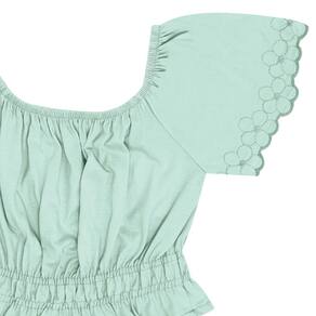Conjunto perfeito para dias ensolarados! Composto por blusa meia malha na cor tiffany, mangas curtas, bordado diferenciado nas mangas e elástico franzido na cintura deixando a peça ainda mais charmosa e perfeita para os dias quentes. Já o short jeans índigo claro possuí elastano na cintura, bolsos funcionais e fechamento em botão frontal.