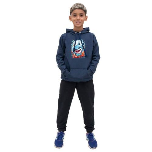 Conjunto Infantil Menino Blusa Manga Longa Estampa de Tubarao e Calça Lisa Moletom Confortavel - Azul Marinho - 16