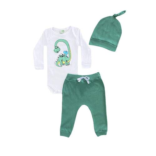 Nosso Conjunto Infantil Menino Body Branco Dino + Calça Verde e Touca - Lumagy é a coisa mais fofa desse mundo! O conjunto contém 1 body branco com estampa de dinossauro, onde conta com botões de pressão entre pernas que facilitam na hora da troca; 1 calça verde super estilosa; e para completar o look, acompanha também uma touca muito linda! As cores casam entre si, fazendo o composê perfeito.