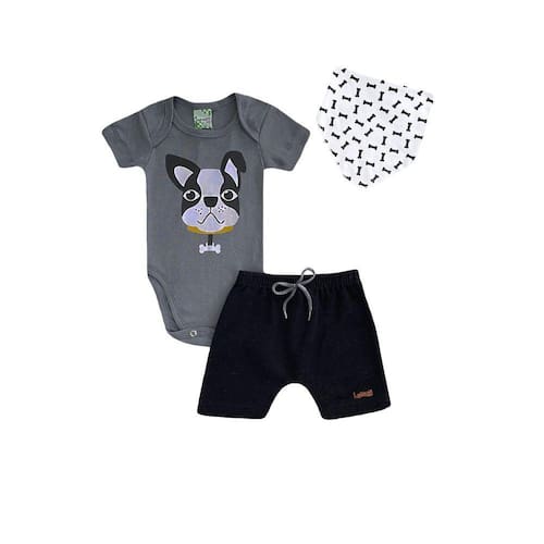 Nosso Conjunto Infantil Menino Body Cinza Cachorro + Bermuda Preta e Bandana - Lumagy é a coisa mais fofa desse mundo! O conjunto contém 1 body cinza com estampa de um cachorrinho, onde conta com botões de pressão entre pernas que facilitam na hora da troca; 1 bermuda preta super estilosa; e para completar o look, acompanha também uma bandana muito linda! As cores casam entre si, fazendo o composê perfeito.