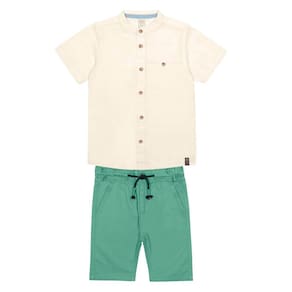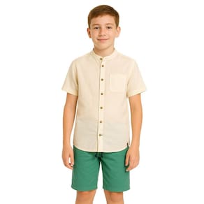 Nada mais prático e estiloso para o dia a dia do que um conjunto infantil que une conforto e charme. A camisa gola padre, em tom off-white, tem modelagem reta, bolso funcional no peito e fechamento por botões de madeira natural, conferindo toque artesanal ao look. A bermuda verde, de cintura elástica com cordão ajustável e corte até o joelho, oferece liberdade total para corridas, pulos e outras aventuras.