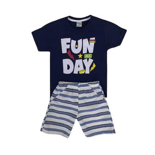 Nosso Conjunto Infantil Menino Camiseta Azul Marinho Fun Day e Bermuda Sarja - Didiene é ideal para crianças que gostam de aventuras no seu dia-a-dia, onde ele vai poder brincar e se divertir por horas com conforto e qualidade. A camiseta foi fabricada em meia malha, possui estampa "Fun All Day", deixando a brincadeira ainda mais divertida! Além disso, a bermuda de sarja possui listras que faz o composê perfeito com a blusa.