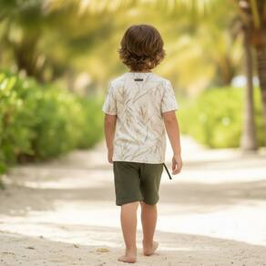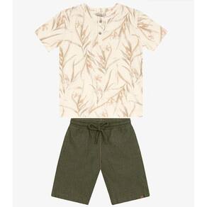 A camiseta possui estampa de folhagem com abertura frontal decorativa, trazendo charme ao visual.