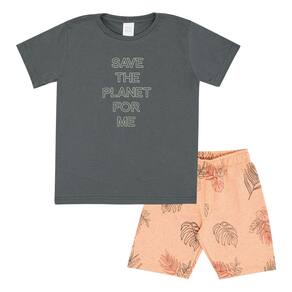 Prático e ideais para qualquer ocasião este conjunto composto por camiseta e bermuda. Camiseta meia malha na cor carbono, possuí gola reforçada e estampa puff com escrita "salve o planeta por mim". Já a bermuda em moletom linho na cor pêssego possuí elástico na cintura para maior conforto e movimentação e estampa de animais.