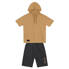 Dê um toque de sofisticação ao guarda-roupa do seu pequeno com o conjunto infantil da Mundi! Composto por uma camiseta em meia malha, este conjunto possui um prático bolso canguru, capuz e cadarço ajustável. A bermuda em ribana orion traz conforto e estilo, com escrita lateral em relevo, bolsos e cós elástico. Ideal para as aventuras diárias, esse look combina conforto e modernidade, permitindo que os meninos brinquem com estilo e liberdade!