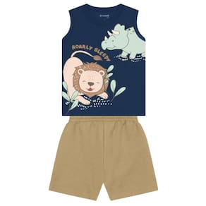 Conjunto infantil menino composto por uma regata confeccionada em malha, apresenta uma divertida estampa de animaizinhos e gola redonda. A bermuda é feita em moletinho sem pelúcia interna, garantindo conforto e liberdade de movimento, com cós em elástico para melhor ajuste. Este conjunto é perfeito para o dia a dia, unindo estilo e praticidade.