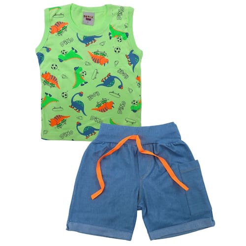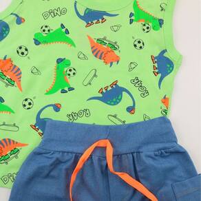 Este conjunto infantil menino é perfeito para momentos de diversão com estilo! A regata em meia malha traz uma estampa vibrante de dinossauros, inspirando aventuras pré-históricas. A bermuda em algodão jeans possui um design moderno com bolsinho lateral, detalhes em pesponto, elástico confortável na cintura e um cordão decorativo que adiciona um charme especial. É a escolha ideal para o dia a dia dos pequenos exploradores.