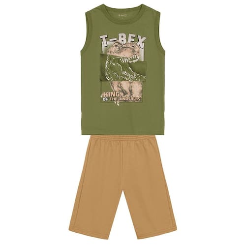 Deixe seu pequeno pronto para aventuras com o incrível conjunto infantil da Brandili! Composto por uma regata em meia malha, apresenta uma divertida estampa em puff do dinossauro T-rex, perfeita para os pequenos amantes de dinossauros. A bermuda em moletinho possui cós elástico, garantindo conforto e liberdade de movimentos. Ideal para dias quentes, esse conjunto é a escolha perfeita para brincar com estilo. Combine com tênis e um boné para um look super descolado e divertido!