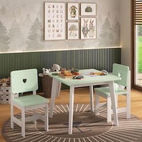 Combinada com a Cadeira Infantil Sofia, o conjunto transforma qualquer ambiente em um espaço mais alegre e acolhedor. As cadeiras possuem estrutura em madeira maciça de pinus com acabamento em verniz, que valoriza o tom natural da madeira. As partes em MDF recebem pintura laqueada com brilho fosco, unindo estilo e resistência. Acabamento da Cadeira/Banco: Verniz Acabamento da Mesa: Verniz Acompanha Manual de Instalação: Sim Ambiente Principal: Quarto Infantil Cadeira/Banco estofada: Não Cadeira/Banco suporta até: 30 kg codigo_ean: 7900288203793 Complexidade da Montagem: Baixa: pode ser montado por uma pessoa sozinha Configuração do Conjunto: Mesa com Cadeiras Cor: Branco / Verde Cor do Produto: Branco / Verde Design da Base: Padrão Enchimento do Encosto: MDF Escala de Brilho: Semi-Brilho Espessura do Tampo: 15 mm Estrutura do Assento: MDF Estrutura do Encosto: MDF Formato do Tampo: Quadrado Itens Inclusos: 1 Mesa, 2 Cadeiras, Kit Ferragens e Manual de Montagem Linha ou Coleção: Sofia Manual de Montagem e Instalação: https://product-hub-prd.madeiramadeira.com.br/671005244/documents/ba4da1dc-edbd-4ab1-931b-3823fb429f9b308883557441753210868526.pdf Marca: Empório Paraíso Material da Base da Mesa: MDF Material da Estrutura da Cadeira: Madeira Maciça Material do Tampo: MDF Material Principal: Madeira Maciça Material Principal das Cadeiras/Bancos: Madeira Maciça Medida da Cadeira/Banco (A x L x P): 57,5X29X31 Medida da Mesa (A x L x P): 48X60X60 Medida do Tampo (L x C x E): 60X60X1,5 Mesa Dobrável: Não Mesa Extensível: Não Mesa suporta até: 15 kg Necessita Montagem: Sim Origem do Produto: Nacional Peso da Cadeira/Banco: 2,9 kg Peso da Mesa: 6 kg Possui Apoio para Braços: Não Possui Apoio Para os Pés: Não Possui Prateleiras: Não Possui Rodízio: Não Possui Suporte Giratório: Não Possui Vidro: Não Quantidade de Cadeiras: 2 Recomendações de Uso, Manutenção e Limpeza: Limpar Com Pano Seco Sistema de Montagem: Parafusos Tipo de Assento: Fixo Tipo de Encosto: Fixo Marca: Não Informado