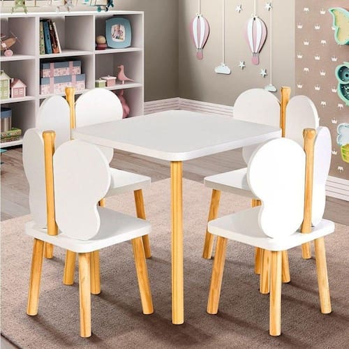 A Mesa Infantil Hora de Brincar tem 2 finalidades: trazer um espaço único, exclusivo para a criança brincar e ainda, completar o ambiente de um jeito harmonioso e específico para criança. Um móvel de contornos leves, com a mistura perfeita de 2 cores para deixar o ambiente com aspecto mais amplo. Seu tamanho permite aproveitar todo o período da 1ª infância da criança, sendo essa fase toda baseada nas brincadeiras dos joguinhos, pinturas, massinhas...e para isso, é muito importante uma mesinha no ambiente onde isso tudo vai acontecer. A mesa conta com estrutura com tampo feito em MDF e pés em Madeira Maciça, assegura maior resistência e estabilidade para as brincadeiras das crianças. A cadeira infantil conta com um design divertido e ludíco em formato de borboleta. Altura do Conjunto: 58.6 cm Ambiente: null Ambiente Principal: Quarto Infantil Cor: Branco/Pinus Informação Complementar: 1x Mesa para Quarto Infantil Hora de Brincar Branco/MarromlLargura: 50 cmAltura: 51,3 cmPeso: 6,3 kgProfundidade: 50 cmNecessita Montagem: Sim4x Cadeira Infantil Hora de Brincar Branco/MarromlLargura: 29 cmAltura: 58,6 cmPeso: 3,5 kgProfundidade: 29 cmNecessita Montagem: Sim Material Principal: MDF Suporta Até (kg): 15 kg