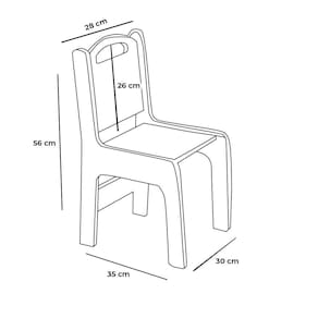 Cadeira Infantil Medidas Aproximadas: Altura total: 56 cm Largura do assento: 28 cm Profundidade: 30 cm Altura do encosto: 26 cm Comprimento da base: 35 cm