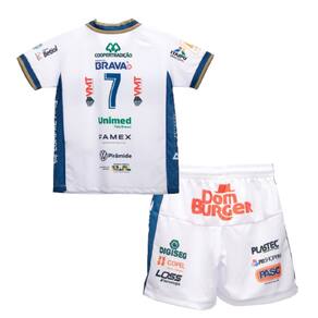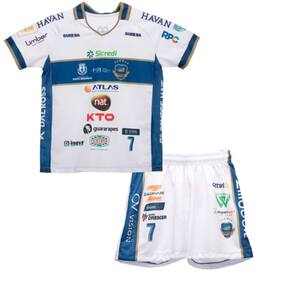 Design Exclusivo: O conjunto inclui uma camiseta e um calção, ambos com o logo oficial do Pato Futsal. O design colorido e vibrante, inspirado no uniforme dos jogadores, permite que os pequenos mostrem seu orgulho pelo time com muito estilo.