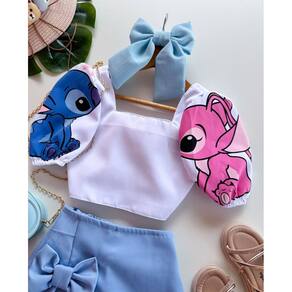 Conjunto feminino Stitch moda blogueirinha, composto por um cropped forrado manga princesa com estampa do personagem Stitch e amarras nas costas, o queridinho das crianças e short saia com laço decorativo na frente que dá um charme todo especial ao look. Esse conjunto é perfeito para as princesas que gostam de arrasar com look´s super estilosos, que chamam a atenção por onde passa. Nesse anúncio existe dois modelos de conjunto, Stitch Urso o short é jeans com bordado e cintura ajustável