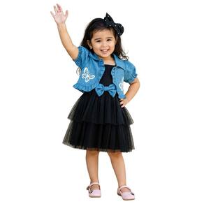 Encante-se com a delicadeza deste conjunto infantil composto por vestido Preto em tule com laço azul e casaquinho jeans leve com estampa de borboletas. Um look encantador para ocasiões especiais, festas ou passeios, garantindo estilo e conforto para sua pequena.