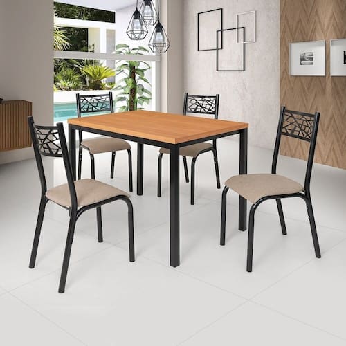 Este tipo de material é muito superior que os acabamentos em Pintura UV (que acaba sendo o tipo mais utilizado na fabricação dos móveis). Medida da Mesa (A x L x P): 78cm x 72cm x 110cm Peso da Mesa: 16,02 kg Mesa suporta até: 10.0000 Acabamento da Cadeira/Banco: Pintura Epóxi Acabamento da Mesa: Pintura Epóxi Acompanha Manual de Instalação: Sim Altura do Conjunto: 78 cm Ambiente Principal: Cozinha Cadeira/Banco Estofada: Somente Assento Estofado Cadeira/Banco estofada: Somente Assento Estofado Cadeira/Banco suporta até: 100.0000 codigo_ean: 7900288076151 Complexidade da Montagem: Baixa: pode ser montado por uma pessoa sozinha Configuração do Conjunto: Mesa com Cadeiras Cor: Preto Fosco/Bege/Freijo Cor da Base: Preto Cor das Cadeiras: Preto Cor do Produto: Preto Fosco/Bege/Freijo Cor do Tampo: Bege Cor Secundária: Bege De Canto (Canto Alemão): Não Design da Base: 4 Pés Escala de Brilho: Fosco Espessura do Tampo: 30 mm Estrutura do Encosto: Aço Formato do Tampo: Retangular Itens Inclusos: 1 Mesa + 4 Cadeiras + Manual de Montagem Largura do Conjunto: 72 cm Linha ou Coleção: Jade Manual de Montagem e Instalação: https://product-hub-prd.madeiramadeira.com.br/977586/documents/cff42c14-641a-49b7-8bce-2a2e80bbe2bbd1198656360017168964449397.pdf Marca: Ciplafe Material da Base da Mesa: Aço Carbono Material da Estrutura da Cadeira: Aço Carbono Material do Tampo: BP Material Principal: Aço Carbono Material Principal das Cadeiras/Bancos: Aço Carbono Medida da Cadeira/Banco (A x L x P): 91cm x 49cm x 37cm Medida do Tampo (L x C x E): 72cm x 110cm x 3cm Mesa Dobrável: Não Mesa Extensível: Não Necessita Montagem: Sim Origem do Produto: Nacional Peso da Cadeira/Banco: 3,65 kg Possui Apoio para Braços: Não Possui Apoio Para os Pés: Não Possui Prateleiras: Não Possui Suporte Giratório: Não Possui Vidro: Não Profundidade do Conjunto: 110 cm Quantidade de Cadeiras: 4 Quantidade de Lugares: 04 Recomendações de Uso, Manutenção e Limpeza: Não utilizar produtos quimicos na limpeza, nâo expor a chuva, nâo reclinar, nâo pisar Sistema de Montagem: Parafusos Tipo de Assento: Removível Tipo de Encosto: Fixo