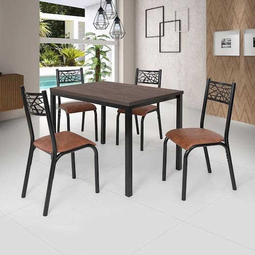 Este tipo de material é muito superior que os acabamentos em Pintura UV (que acaba sendo o tipo mais utilizado na fabricação dos móveis). Medida da Mesa (A x L x P): 78cm x 72cm x 110cm Peso da Mesa: 16,02 kg Mesa suporta até: 100 kg Acabamento da Cadeira/Banco: Pintura Epóxi Acabamento da Mesa: Pintura Epóxi Acompanha Manual de Instalação: Sim Almofada do assento: Removível Almofada do encosto: Não Possui Altura do Conjunto: 78 cm Ambiente Principal: Cozinha Cadeira/Banco estofada: Somente Assento Estofado Cadeira/Banco suporta até: 100 kg Complexidade da Montagem: Baixa: pode ser montado por uma pessoa sozinha Cor: Preto Fosco/Caramelo/Amendoa Cor da Base: Preto Cor do Produto: Preto Fosco/Caramelo/Amendoa Cor do Tampo: Marrom Cor Secundária: Marrom De Canto (Canto Alemão): Não Design da Base: 4 Pés Escala de Brilho: Fosco Espessura do Tampo: 30 mm Estrutura do Assento: Madeira/Espuma/Sintético Estrutura do Encosto: Aço Formato do Tampo: Retangular Itens Inclusos: 1 Base de Mesa, 4 Cadeiras, 1 Tampo de Madeira, Kits de Parafusos e manual de montagem Linha ou Coleção: Jade Manual de Montagem e Instalação: https://product-hub-prd.madeiramadeira.com.br/910763/documents/537ee9a5-ff54-4e5b-857c-ae6e77fa383f198656360017168964449397.pdf Material da Base da Mesa: Aço Carbono Material da Estrutura da Cadeira: Aço Carbono Material do Tampo: BP Material Principal: Aço Carbono Material Principal das Cadeiras/Bancos: Aço Carbono Medida da Cadeira/Banco (A x L x P): 91cm x 49cm x 37cm Medida do Tampo (L x C x E): 72cm x 110cm x 3cm Mesa Dobrável: Não Mesa Extensível: Não Necessita Montagem: Sim Origem do Produto: Nacional Peso da Cadeira/Banco: 3,65 kg Possui Apoio para Braços: Não Possui Apoio Para os Pés: Não Possui Prateleiras: Não Possui Rodízio: Não Possui Suporte Giratório: Não Possui Vidro: Não Quantidade de Cadeiras: 4 Quantidade de Lugares: 04 Recomendações de Uso, Manutenção e Limpeza: Não utilizar produtos quimicos na limpeza, nâo expor a chuva, nâo reclinar, nâo pisar Sistema de Montagem: Parafusos Tipo de Assento: Removível Tipo de Encosto: Fixo