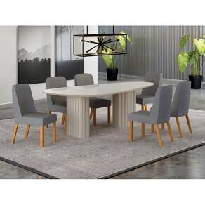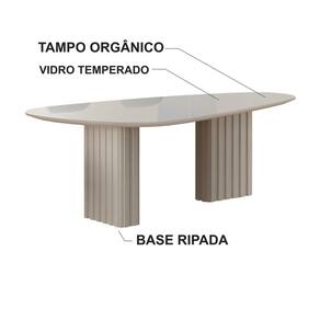 ? Destaques do Produto • Design moderno com tampo orgânico • Base dupla: ripada • Cadeiras com encosto acabamento premium • Estrutura resistente em madeira maciça de eucalipto (cadeiras) • Estofado elegante e fácil de harmonizar • Ideal para ambientes sofisticados e contemporâneos
