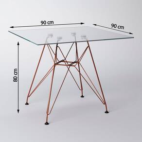 CONJUNTO JANTAR EAMES DE FERRO COBRE E TAMPO QUADRADO VIDRO - 90CM 4 CADEIRAS BRANCA O Jogo de Mesa 4 Cadeiras Eames se destaca pelo design moderno e sofisticado. A Cadeira Eames é confeccionada em policarbonato, sua base é em ferro, o que confere total resistência e conforto, o tampo é confeccionado em vidro, possuindo base em ferro. O Jogo de Mesa 4 Cadeiras Eames da vida ao ambiente além de combinar com todos os tipos e cores de móveis.