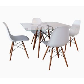 CONJUNTO JANTAR EAMES TAMPO QUADRADO VIDRO 90CM - 4 CADEIRAS BRANCAS O Jogo de Mesa 4 Cadeiras Eames se destaca pelo design moderno e sofisticado. A Cadeira Eames é confeccionada em policarbonato, sua base é em Madeira maciça, o que confere total resistência e conforto, o tampo é confeccionado em vidro, sua base é em Madeira maciça. O Jogo de Mesa 4 Cadeiras Eames da vida ao ambiente além de combinar com todos os tipos e cores de móveis.