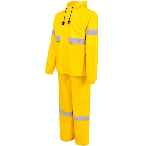 - Material: nylon emborrachado (poliamida/PVC). - Costura: overloque 5 fios com selagem térmica interna. - Fechamento jaqueta: zíper de nylon e lapela com fixador ajustável. - Regulagem calça: elástico e cordão na cintura. - Faixas refletivas: 50 mm no tórax, costas e braços.