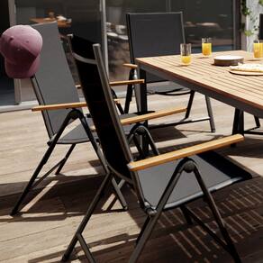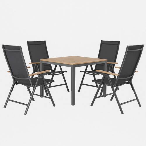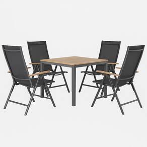 Transforme seu espaco ao ar livre em um verdadeiro refugio de conforto e estilo com o Conjunto de Moveis para Jardim Oris da Naterial. Este conjunto contemporaneo, composto por uma mesa quadrada e quatro cadeiras reclinaveis, e a escolha ideal para quem busca unir elegancia e funcionalidade em areas externas sem cobertura. Feito com materiais de alta qualidade, como aluminio e madeira de eucalipto, este conjunto oferece durabilidade e resistencia, mesmo em ambientes umidos. O tampo da mesa, em madeira eucalipto, complementa a estrutura de aluminio preto, proporcionando um visual sofisticado e moderno. As cadeiras, tambem em aluminio, possuem assento e encosto em tecido textilene, garantindo conforto e praticidade. Alem disso, elas sao dobraveis, facilitando o armazenamento e o transporte. Com dimensoes que se adequam perfeitamente a espacos variados, a mesa mede 74,6x89x89 cm, enquanto as cadeiras possuem 110x67x67 cm. A montagem e simples, com instrucoes claras no manual, e a complexidade e media, recomendada para mais de uma pessoa. A garantia de 3 anos do fabricante assegura a qualidade e a durabilidade do conjunto. Ideal para refeicoes ao ar livre, este conjunto e perfeito para reunir amigos e familiares em momentos de lazer e descontracao. Com capacidade para quatro pessoas, ele e uma excelente opcao para quem aprecia o convivio em ambientes externos, proporcionando um toque de sofisticacao e conforto. Principais caracteristicas e especificacoes: Conjunto de Moveis para Jardim Oris. Composto por 5 pecas: 1 mesa e 4 cadeiras. Estrutura em aluminio e madeira eucalipto. Cor preta, estilo contemporaneo. Mesa quadrada com dimensoes 74,6x89x89 cm. Cadeiras dobraveis com dimensoes 110x67x67 cm. Assento e encosto em tecido textilene. Uso indicado para areas externas umidas. Ideal para refeicoes ao ar livre. Montagem media, com manual de instrucoes. Garantia de 3 anos.