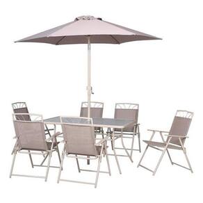 Conjunto Jardim 8 Pecas Cadeira Mesa Ombrelone Conjunto para Jantar Santa Lucia 8 Pecas Taupe e perfeito para quem busca um ambiente elegante e charmoso para reunir familia e amigos. Feito com materiais de alta qualidade, este conjunto e composto por 6 cadeiras confortaveis, 1 mesa espacosa e 1 guarda-sol para proteger do sol. Com estrutura de aco resistente e superficie em textileno, este conjunto e duravel e facil de limpar. Alem disso, a mesa possui tampo de vidro e as cadeiras sao dobraveis, facilitando o armazenamento quando nao estiverem em uso. Com capacidade para 8 pessoas, este conjunto e ideal para uso domestico e garantira momentos especiais ao ar livre. A cor Taupe traz um toque sofisticado ao ambiente, enquanto as dimensoes generosas garantem conforto para todos os convidados. e com de 3 meses, este conjunto e a escolha perfeita para quem valoriza qualidade e design. Marca: Não Informado