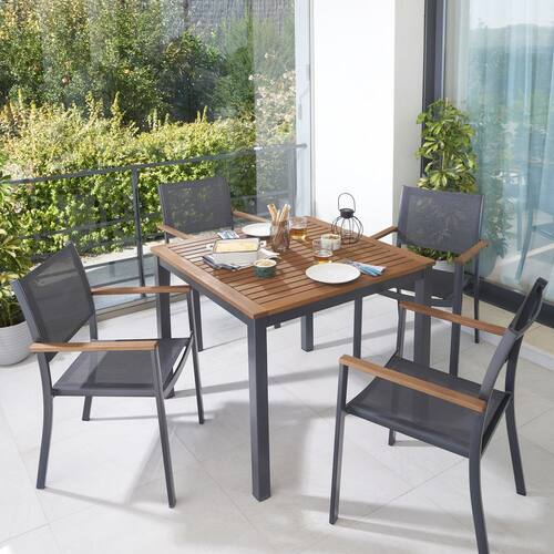 Resumo das Caracteristicas: - Tipo de Produto: Conjunto para Jardim - Componentes: Mesa e 4 Cadeiras - Dimensoes da Mesa: 75cm (altura) x 89cm (largura) x 89cm (profundidade) - Materiais: Aluminio e Madeira - Cores: Cinza e Marrom - Modelo: Oris - Marca Fabricante: Naterial Marca: Não Informado Ean: 744299151660