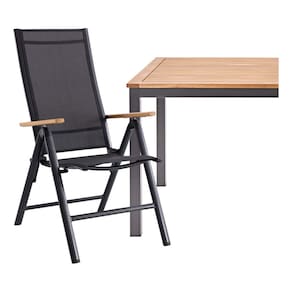 Transforme seu espaco ao ar livre em um oasis de conforto e estilo com este conjunto para jardim. A mesa robusta, com dimensoes de 74,6 cm de altura, 89,3 cm de largura e 150 cm de comprimento, oferece espaco ideal para refeicoes e convivio. Complementando a mesa, seis cadeiras reclinaveis proporcionam versatilidade e adaptam-se as suas necessidades de relaxamento. A combinacao de materiais de alta qualidade, como aluminio e madeira, confere durabilidade e um visual sofisticado em tom preto, garantindo que o conjunto se integre harmoniosamente a qualquer paisagem.