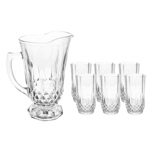 Características: Jarra de 1,25L e 6 Copos de 260ml: Perfeito para servir sucos, água ou drinks com praticidade e charme. Material em Vidro de Alta Qualidade: Proporciona durabilidade e transparência, realçando as cores das bebidas. Cuidados com a Limpeza: Lave com detergente neutro e esponja macia, garantindo a manutenção do brilho e evitando riscos. Design de Diamante: Detalhe sofisticado que agrega elegância à peça, tornando-a um item decorativo.