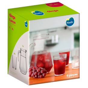 O conjunto de copos com jarra Ginga contém 4 copos de 265 ml e 1 jarra de 1,5 L e é perfeito para o uso no dia a dia, tornando-o mais prático. Os produtos Nadir são sinônimo de tradição e qualidade, produzidos em vidro de excelente qualidade, mais brilhante e transparente, proporcionam elegância e sofisticação à sua mesa em qualquer ocasião.