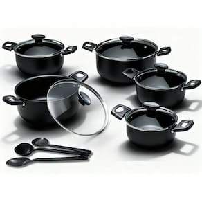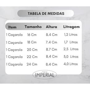 O conjunto de panelas com a qualidade que sua família merece e o precinho que seu bolso merece Esse conjunto de panelas é de alumínio com revestimento em teflon antiaderente, isso mesmo, a comida não gruda O revestimento antiaderente é por dentro e por fora, o que facilita muito a limpeza das panelas e aumenta bastante o tempo de vida útil das suas panelas. Todos as panelas da marca Imperial são testadas, aprovadas e vão com selo de qualidade Inmetro, garantindo a segurança e a saúde da sua família, além de comprovar a qualidade do produto que é submetido a testes rigorosos antes de ir para sua casa. Todas as panelas desse conjunto possuem tampa de vidro temperada que são super resistentes, quase impossível de quebrar, as tampas também possuem saída de vapor que é item de segurança imprescindível para sua familia. Todos os cabos e poméis são de baquelite, material que não esquenta para garantir sua segurança na hora do preparo dos alimentos.