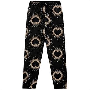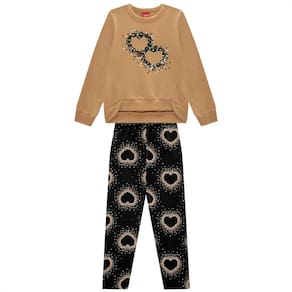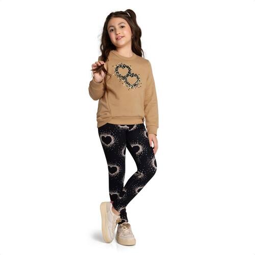 Conjunto Juvenil Kyly Moletom Peluciado Menina Camurça Preto - Casaco bordado com coração e lantejoulas + calça legging estampada.