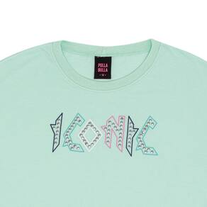 Para meninas que gostam de manter o estilo com o roupas confortáveis e despojadas. Conjunto na cor tiffany composto por blusa meia malha com aplique frontal metalizado escrito "Icônico" e short moletino com elástico no cós para maior conforto e movimentação. Detalhes encantadores e básicos do jeito que elas amam.