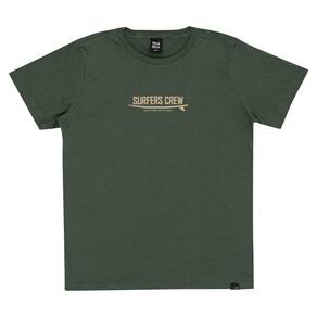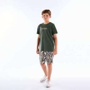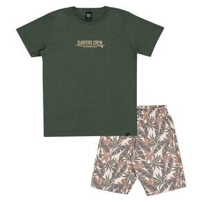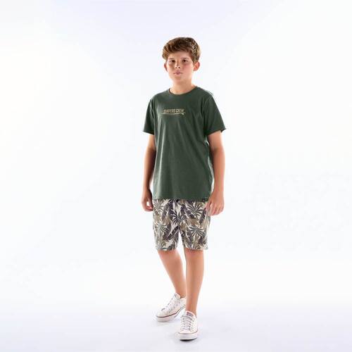 Básico e moderno para o dia a dia dos meninos! Conjunto composto por camiseta meia malha na cor militar, gola reforçada, mangas longas e estampa frontal com escrita "equipe de surf. Enfrente as ondas, não tenha medo" e bermuda moletom linho com estampa tropical sublimado militar, ideal para usar no dia a dia ou em passeios na praia com os amigos.